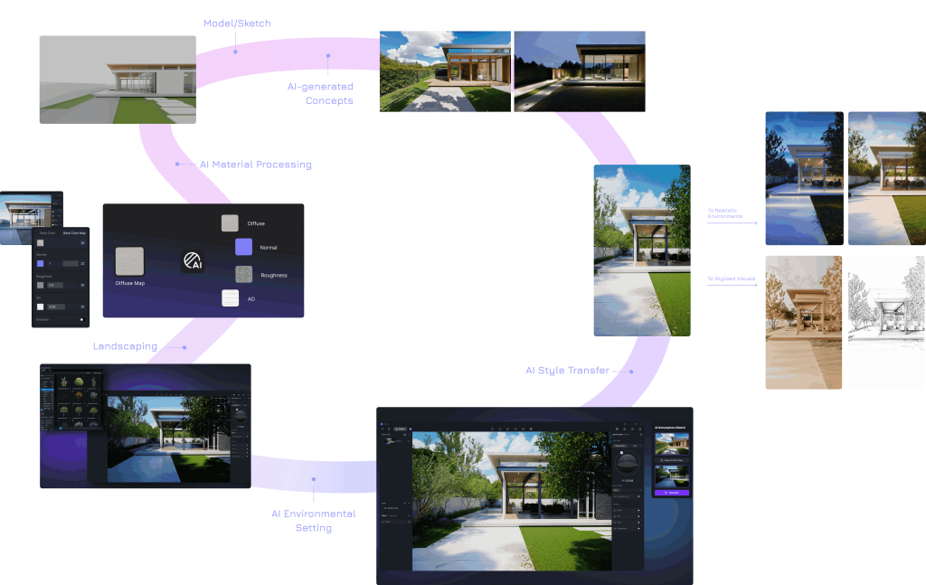D5 AI efficiently handles everything from spatial concept generation to environmental lighting, material editing, post-production, and even 3D modelling.